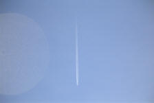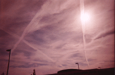 The picture above was taken in late November, 2003, in the Palouse Region of southeast Washington State. The camera was pointed in the direction of Spokane, Washington. Notice the chemtrail near the top of the picture that has spread out in contrast to the freshly-laid trails below. Eventually, all the chemtrails spread out to create a fairly uniform haze or “chemclouds” that partially block the sun. Sometimes the chemclouds are are so thick that you cannot tell where the sun is at. To view more chemtrail photos visit the Chemtrail Gallery.